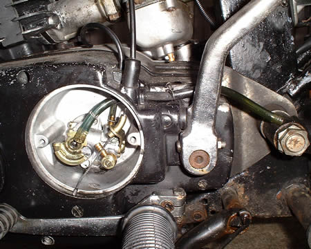 - The carb was very loose (!) on the inlet manifold so I nip that up. I stowed the spare replacement Sparking Plug and spanner in the side panel (No more pushing) Also checked the tyre pressures, now 24 front 27 rear.. The battery needs a cable tie to stop it rattling in 3G turns. The exhaust to cylinderhead was leaking but that needs a C spanner. The Speedo had stopped working so I checked the drive.. Nothing.. Things for Part Two, dear reader.. Things for Part Two.. Right - Gratuitous Oil Pump closeup shot.. |